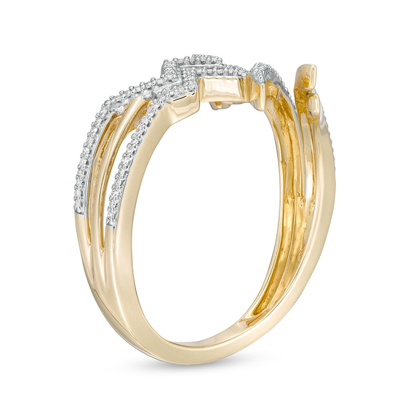 Crafted in warm 10K gold, this split-pronged ring features a subtle bypass design with a curved polished and diamond-lined ribbon. Featuring 1/8 carat diamonds with a dazzling polished luster, this ring is uniquely yours.